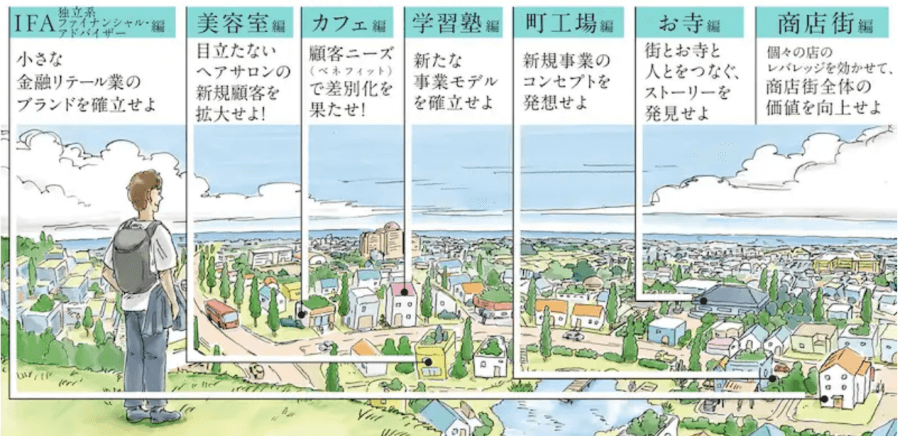 カフェ編、町工場編、学習塾編、お寺編、独立系編、美容室編、商店街編などから、ご自分に合ったストーリーだけを読んでもOKです!