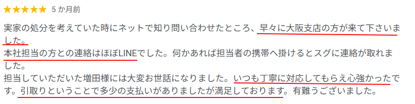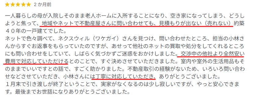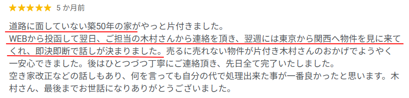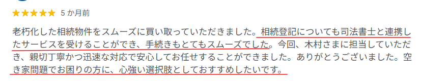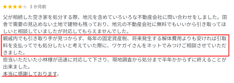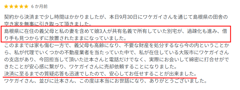 Googleに寄せられた口コミにはどこの不動産会社にも相手にされなかった空き家等の物件がワケガイに買い取って(引き取って)もらって助かった、本当にありがたいという声が非常に多かったです。