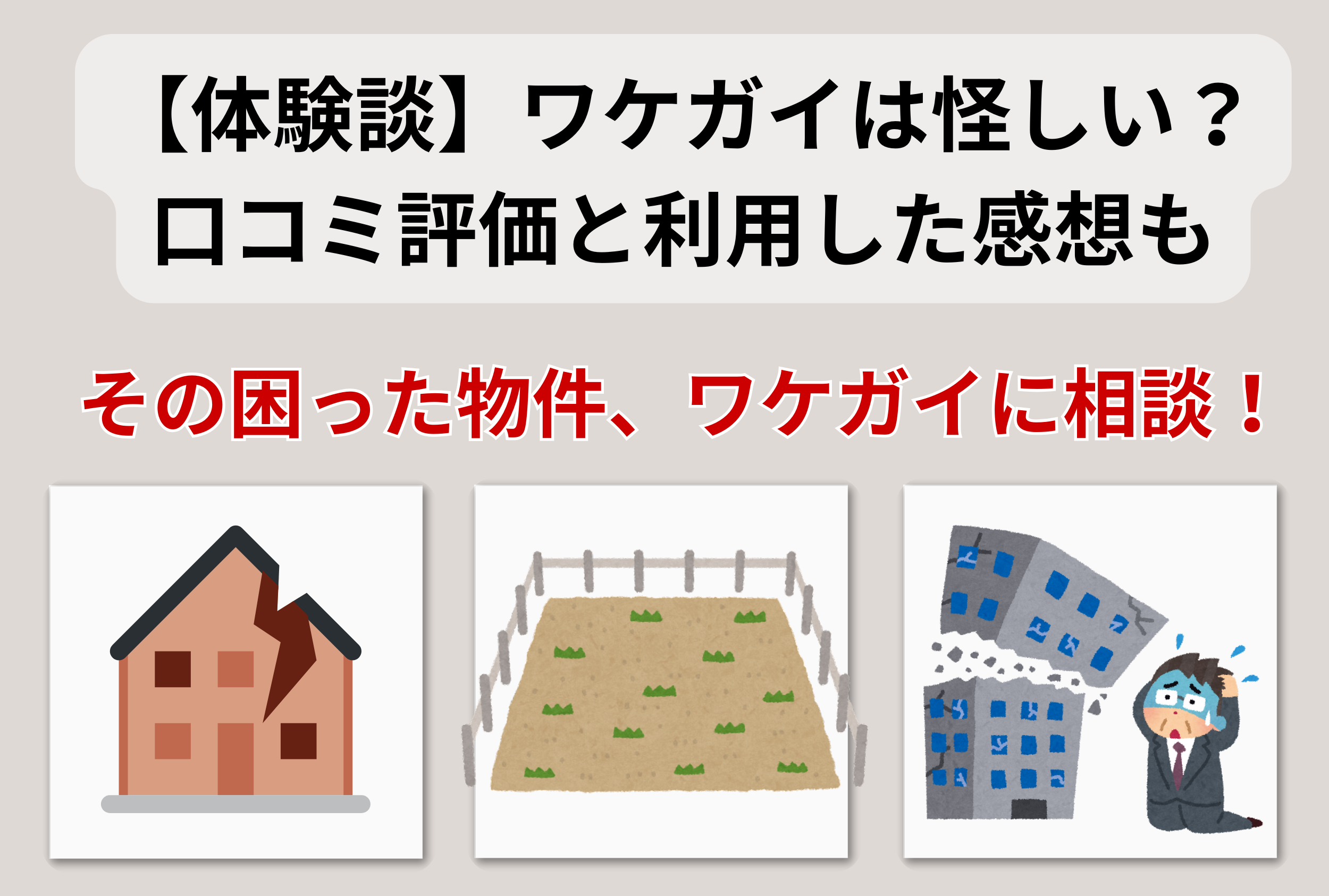 この記事では困った不動産を買い取ってくれる「ワケガイ」は怪しいのかやばいのか、実際にワケガイに空き家の売却相談した体験談を交えてまとめていきます。